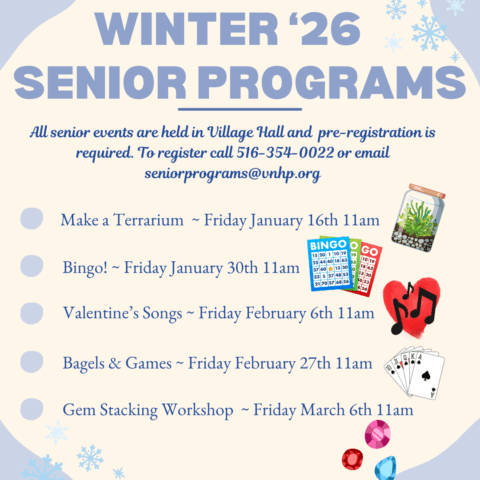 The Village of New Hyde Park’s Senior Programs brings Seniors together at Village Hall for movies, crafts, food, and conversation. All program announcements will be posted on our website.